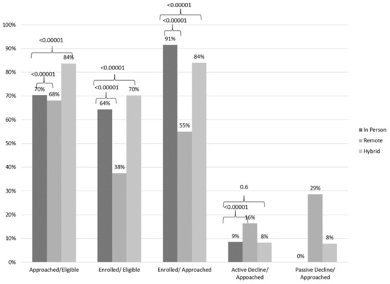 The approach saturation was calculated from the total approached as a percentage of the total newborns who were screened by the NBS program. The proportion enrolled/eligible is the total enrolled in the study as a percentage of the total newborns who were eligible for the study. The proportion enrolled/approached is the total enrolled as a percentage of the total approached, and proportion declined/approached is the total who actively declined after being approached as a percentage of total approached. The proportion passive declined/approached is the total who indicated consent to participate in the study but did not return a signed consent form. Enrollment rates were stratified by language of consent for each institution. Chi square analysis was used to compare proportions between pre-pandemic and the other periods of recruitment, remote, and hybrid. Analysis was completed in SAS [8].