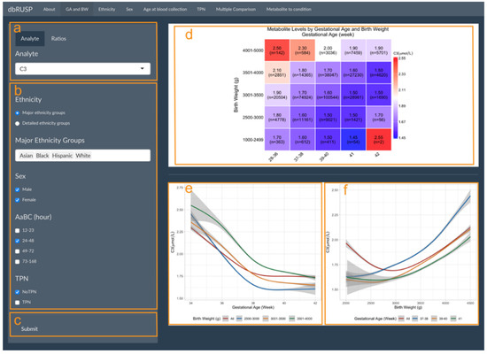 GA and BW are highly correlated and can be analyzed together in one panel under the first module. As shown in Figure 1, this panel is divided into two parts with an operating part (input, left side) and a results part (output, right side). Users can select metabolic analytes or analyte ratios (Figure 1a, C3 shown as an example) and include cohorts based on selected variables. Selections can be based on ethnicity (major or detailed grouping), age at blood collection (24–48 h), sex (male and female), and with or without TPN (Figure 1c). After clicking submit, the results are shown on the right (Figure 1d–f).