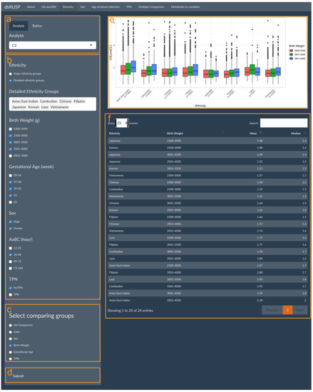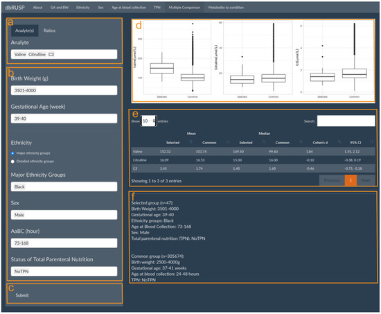 dbRUSP’s second module was designed for the analysis of joint effects from multiple variables on NBS metabolic levels. Users can select newborns based on specific covariate selections and compare differences in their metabolite levels to the “common” metabolite ranges (e.g., BW 2500–4000 g, GA 37–41 weeks, Aabc 24–48 h, no TPN) among newborns in the “reference” group. Similar to Module 1, there are two parts in this panel: operating part (left part of panel) and results part (right part of panel). Users can select metabolic analytes or analyte ratios (Figure 3a, Valine, Citrulline, and C3 as examples here), include cohorts based on variables selected in the operating part (Figure 3b), and click submit for analysis (Figure 3c). In the results part, users can inspect parallel boxplots of the distribution of metabolite levels between the selected cohort and the common groups (Figure 3d) and summary reports for each group comparison, which include the mean, median, and Cohen’s d for the selected metabolites and covariate ranges for the selected and the common group (Figure 3e). Compared to the common reference group, newborn Black males with a BW between 3501 and 4000 g, GA between 39 and 40 weeks, age at blood collection between 73 and 168 h, and no TPN have significantly higher Valine levels (Cohen’s d = 1.84, 95% CI 1.55 to 2.12), slightly lower C3 levels, and no significant differences in Citrulline levels. Elevated Valine levels are associated with maple syrup urine disease (MSUD), which could lead to false-positive screening results. C3 is a blood biomarker for methylmalonic acidemia (MMA), and physiologically lower C3 levels at or below the screening cutoff could potentially lead to false negative results.