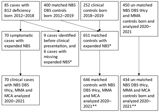 Inclusion of clinical cases and controls, * = missing infants born before 2012, missing expanded NBS, ** = missing infants with unsuccessful 2nd tier analyses, NBS = newborn screening, DBS = dried blood spot, tHcy = total homocysteine, MMA = methylmalonic acid, MCA = methyl citric acid.