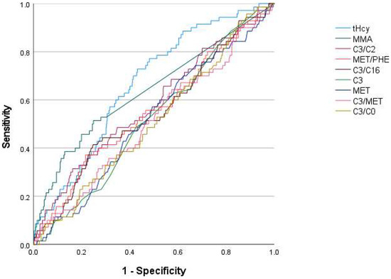 ROC curves of newborn screening parameters’ diagnostic accuracy of being a case with B12 deficiency, cases and matched controls, n = 716. MET = methionine, PHE = phenylalanine, C0 = carnitine, C2 = acetylcarnitine, C3 = propionylcarnitine, C16 = palmitoylcarnitine, tHcy = total homocysteine, MMA = methylmalonic acid.