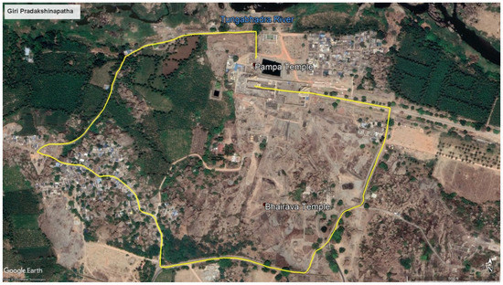 Likewise, contemporary ethnographic accounts of the Virupaksha Temple Complex explicitly remark on the fundamental nature of ritual movement in the temple’s life and its relationship with the surrounding landscape (Kotecha 1982; Wagoner 1991). For example, Dipak Kotecha describes a bi-annual ritual that involved the ceremonial activation of the sacred space of the Hemakuta Hill area known as Giri Pradakshina (the path referred to as the Giri Pradakshinapatha), namely circumambulation of the mountain (see Figure 4). It consists of a processional circumambulation of the entire hill area out to the Tungabhadra River and back to Virupaksha Temple Complex by devotees, priests, musicians, fire-bearers, and light carriers with Virupaksha and Pampa idols (Bharne and Krusche 2013, p. 202). The contemporary path reaffirms the view of the Hemakuta Hill area as a unit of ritual space and the importance of ritual movement to the long history of the site. To a similar effect, the south-north path of movement, much like circumambulation, likely functioned as an act of worship that defined and integrated the sacred space (Kotecha 1982). The linear trajectory across the hill most likely was not the only prescribed form of movement worship occurring at the site from the 9th through to the 14th centuries, although it was a path that connected notions of death (south and Bhairava) to life (north, Pampa, and the river).