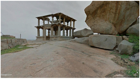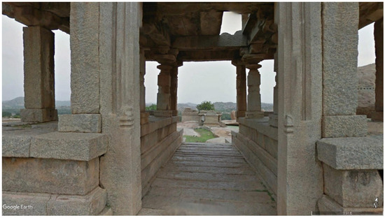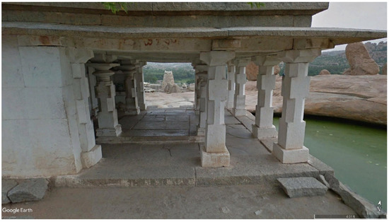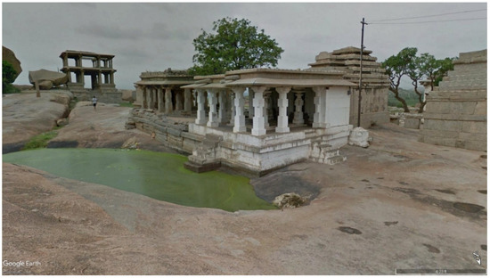 Additionally, the Mula Virupaksha Temple’s nine-bayed mandapa was not fully open. The row of bays closest to the entrance of the temple was enclosed, which was uncommon in the Hemakuta Hill area, while the other bays remained open, thus creating an intimate space for worship. Figure 6 is a view slightly west of south, capturing the north exit of the temple (whitewashed), the cistern, and the kalla upparige (gateway, discussed further below) to the south. This unique mandapa plan and temple orientation intentionally framed the lines of sight for the devotee entering and exiting the temple space and while in the mandapa. The mandapa space and siting of the Mula Virupaksha Temple encouraged an intimate space for ritual activity and darshan (the sacred act of beholding, visual correspondence) between the devotee and the housed deity, unseen from the surrounding landscape in the alcove-type space that the semi-closed mandapa form provided. Indeed, when looking out of the temple, along its longitudinal axis, the devotee sees the pool, granitic boulders of the hill, then in the distance, the sacred Matanga Hill; not the other devotees moving through and worshipping in the Pampa tirtha space, nor other monuments (Figure 7). The only other structures at the top of the Hemakuta Hill by the 12th century were the Bhairava Temple and a companion shrine in the south Bhairava node. As mentioned, these two monuments are in a slight depression that is not observable through digital elevation data available for the site, but the depression is perceptible through GSV. This depression hides the Bhairava Temple and companion shrine from the view of the Mula Virupaksha Temple, possibly acting to hide the gaze of the fearsome Bhairava. Likewise, the rest of the pilgrimage site was not visible once inside the depression, at least not until the 1250–1325 period. As such, it is clear that the microtopographic feature was utilized as a location for the Bhairava Temple and companion shrine to restrict their visibility and thus engendered an introspective and contained experience for devotees.