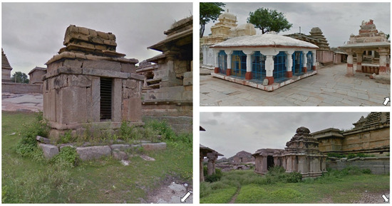 Bottom right image and left image of two Dravida shrines built during the 1050–1100 period, located on the north face of the Hemakuta Hill. Top right image of the Pampa Temple in the foreground and the Royal Immadi Rachamallesvara Memorial Shrine. Imagery from Google Earth.