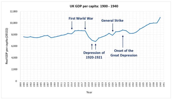 UK GDP per capita from 1900 to 1940, emphasising the crises of the interwar period.1