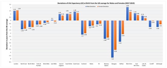 Deviations from the UK average life expectancy (LE) for selected UK regions and districts.2