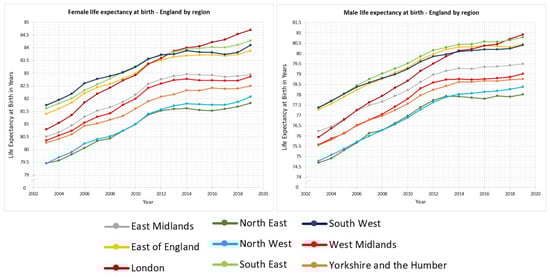 Despite upward trends in life expectancy in all English regions (Figure 3), life expectancy rate of increase has slowed in recent years. Further, regions that fall behind have not caught up with the highest life expectancies during the 21st century. In recent years, London’s life expectancy surpasses all other English regions. The North East and North West continue to lag behind the next lowest, Yorkshire and the Humber, for males and females.