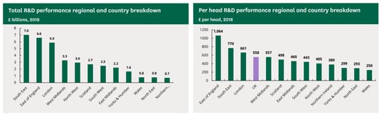 - Office for National Statistics. 2021c. Gross Domestic Expenditure on Research and Development, UK: 2019. In Statistical Bulletin, Office for National Statistics; August 4. Available online: https://www.ons.gov.uk/economy/governmentpublicsectorandtaxes/researchanddevelopmentexpenditure/bulletins/ukgrossdomesticexpenditureonresearchanddevelopment/2019 (accessed on 8 August 2021).