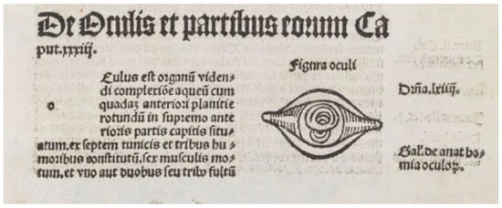 In addition to all these remarks, however, the chapter also deals with various other anatomical and psychological topoi about eyes that were part of the classical medical tradition. In humans, for example, the eyes would indicate the will of the heart and soul to a particular degree (Hundt 1501, fol. H Vv). Hundt also explains how the pupils move and how tears are formed. Finally, eye diseases and their treatment are discussed. The chapter also includes a small drawing of an eye, which makes it easier for the observer to better understand its different layers and muscles (Figure 3).