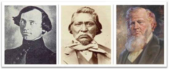 John W. Gunnison (left) from an ambrotype photograph, 1853; portrait alleged to be Kanosh, about 1870; Utah Governor Brigham Young. Credits: Colorado Historical Society, Brigham Young University, Roscoe A. Grover.