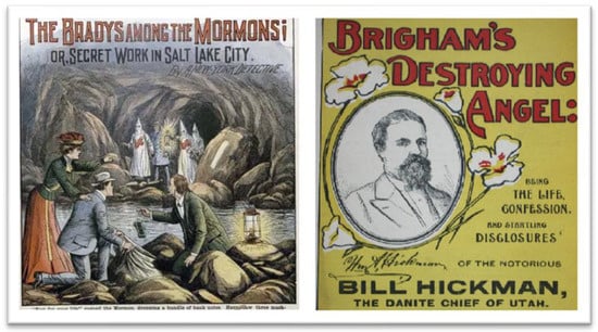 Danites murder and maim in “The Bradys Among the Mormons” (1903) and Bill Hickman’s incredulous memoir (1904). Credits: Juvenile Instructor; Shepard Publishing.