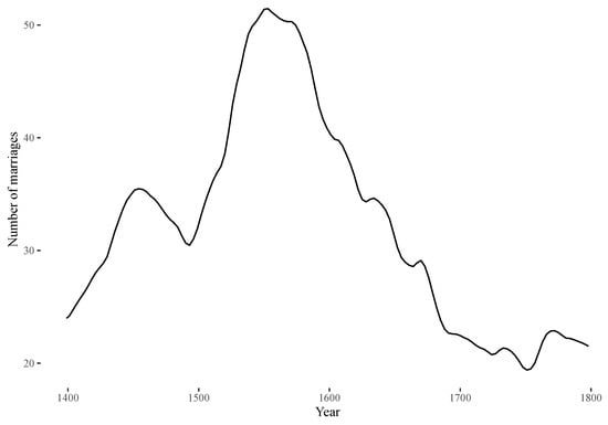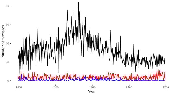 The resulting time series has 399 data points starting in 1398 and ending in 1797. The total number of marriages is 13,019. In some cases, the wife did not belong to the aforementioned closed set of noble families, which is why the normalized noble family name for such individuals was an empty string; the total number of such marriages is 1507. Additionally, there are 335 cases of intra-family marriages, in which the wife and husband belonged to the same (extended) family. This time series is plotted in Figure 1, and split into three lines: the total number of marriages, the number of marriages with non-patrician wives, and the number of marriages within the same family3.