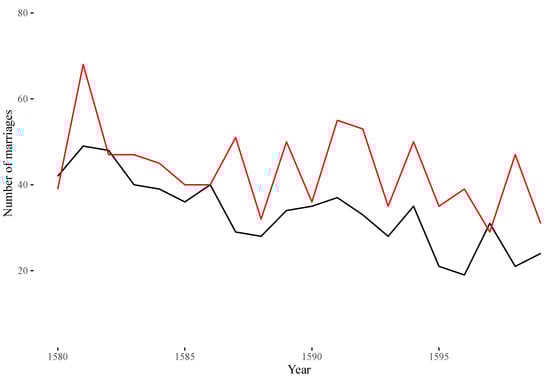 Marriages in Venice from 1580 to 1595. The black line represents the total number of marriage contracts registered according to Cowan (2007b); the red line corresponds to the number of marriages in Puga and Trefler (2014) for the same period.