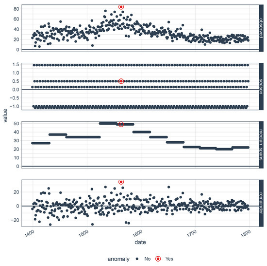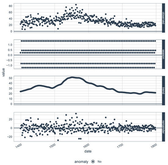 Figure 3 shows the analysis of the time series using the default method, STL, as indicated above, plotted using the plot_anomaly_decomposition function. From top to bottom, it shows the original series, the seasonal component, which follows a period of five years with three years above trend and two years below trend, the trend component with a peak around the mid-16th century, and the remainder, which is the original series minus the sum of the previous two components. Any anomaly using this method would be shown as a circled red dot; in this case, there were no anomalies detected. Trend smoothing, which is computed automatically using this method, is 30 years.