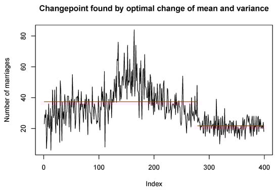 Changepoint determined by the optimal change in mean and variance of the matrimonial time series. Please bear in mind that the x value equal to 0 corresponds to the first year in the series, 1398. Red lines represent averages before and after the changepoint.