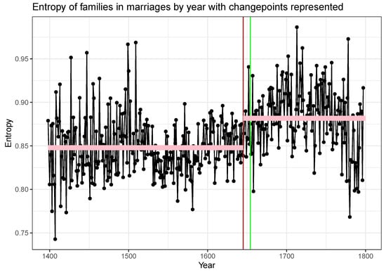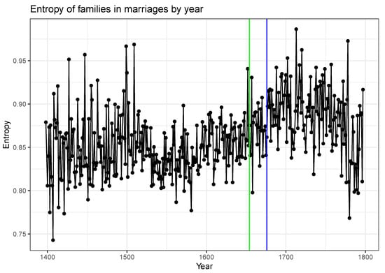 It would be interesting to look at the dataset from another point of view: the entropy of the sequence of marriages. We computed the entropy over the frequencies of families appearing as brides or grooms in a specific year. Entropy is a measure of the amount of information or surprise in a group of data; in this case, it can also be interpreted as diversity. If a single family appears, then the set is totally ordered and predictable, which would yield the lowest entropy; many different families appearing only once would have the highest entropy; anything in between (e.g., fewer families appearing only once or more families with a random number of appearances) will yield any value in between. Since entropy is influenced by the number of different marriages in a year, we normalized this entropy by dividing it by , where N is two times the number of marriages in a year, i.e., the number of persons appearing in marriages in a year. Normalized entropy goes from 0 to 1 in this case. This normalized entropy is depicted in Figure 7, with the computed changepoint marked as a blue vertical line.