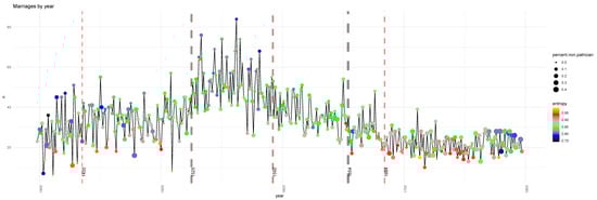 This visualization of the results enables the appreciation of differences before and after the main changepoint and between them. We can see, for instance, how the number of marriages essentially decreased after it, while before, there were more ups and downs. There was a greater abundance of “big dots”, representing a high percentage of non-patrician marriages, after the changepoint, and the color of those dots tended toward “warmer” colors, such as red and orange, over all in the years with fewer marriages. Years with more marriages tended toward green (entropy around 0.85), while before they were darker; years with many marriages tended to have, paradoxically enough, lower entropy.