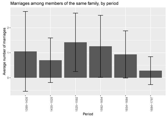 There is another factor that is in play during this period. We have not yet considered the number of self-marriages; that is, marriages in which the two members belong to the same family. However, during this period, as shown by Raines (2013), this period had the highest number of rami or branches of noble families in the absence of other valid (or valuable) candidates. Furthermore, with the objective of keeping wealth within the same family, marriages could occur between two branches of the same family, and obviously, a peak in the number of branches would translate to more marriages within the same family. What we see in Figure 10, which represents the yearly average number of marriages within the same family and its standard deviation, is precisely that peak during this period, with a sharp increase from the previous period and a slight decrease toward the end of the Republic of Venice, when it was reduced to practically 0. Although this peak is of approximately two marriages within the same family every 3 years, it is explained, on the one hand, by legal adjustments and, on the other hand, provides additional causes to the features of this period: low entropy, a high number of marriages, and a low number of non-patrician marriages.