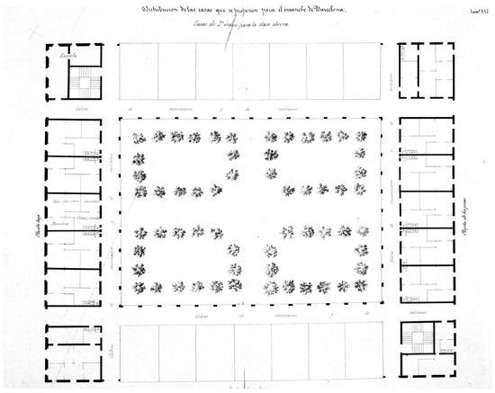 The Spanish urban planning of this period largely responded to these circumstances with expansive strategies, materialized in the form of urban expansions—contrasting with the very popular interior reform operations in the European context following the transformation of Haussmann’s Paris or Vienna’s Ringstrasse (de Lille 1999). Although Spain would not finalize an Extension Law (“ley de ensanche”) until 1864, Barcelona with its Plan Cerdà and Madrid with its Plan Castro advanced toward this solution due to urgent needs. This was followed by Spanish towns such as Bilbao, San Sebastián, Valencia, and Palma. Unsuitable living conditions were one of the driving forces behind these urban proposals, which aimed to overcome the situation through the demolition of city walls—when they existed—and the creation of extensions. Additionally, housing was a central issue in debates surrounding expansions, which were also considered as residential extensions intended to solve the housing problem for lower classes. In the 1859 Atlas of the Theory of City Construction (Cerdà 1991), Ildefons Cerdà cited legislative initiatives from other countries, including the establishment of the Society for Improving the Condition of the Working Classes in England in 1844, and examples of French workers’ cities. Based on these references, in the Memoria del Anteproyecto del Ensanche de Barcelona (1855) (Cerdà 1858), he proposed various properties categorized as second-rate houses for the working class, organized around a block with a central courtyard (Figure 1).