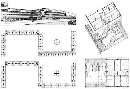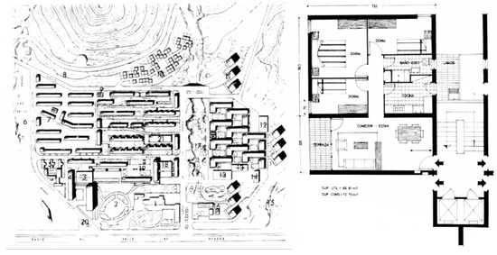 However, the minimal settlements, absorption settlements (“poblados de absorción”), directed settlements (“poblados dirigidos”), and absorption neighborhood units were probably the most interesting architectural manifestations of this period, for the value they added by connecting with external architectural modernity (Santas Torres 2000). The National Housing Plan envisaged various formats, notably the absorption settlements—aimed at housing the population that had proliferated in informal settlements and shanty towns—and the directed settlements—designed to channel the productive capacity of the population into self-built formats (Esteban Maluenda 1999). The Madrid experience of these settlements stood out for the typological quality of some projects, such as the Poblado Fuencarral A by Sáenz de Oiza (Fernández Galiano 1989) (Figure 9), although issues of territorial planning and urban disconnection arose (leading to the later disappearance of many of these neighborhoods) (Moya González 1997).
