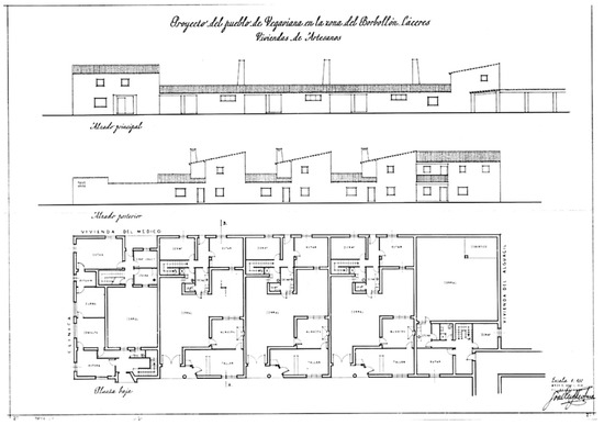 The National Institute of Colonization (“Instituto Nacional de Colonización”—INC), also created in 1939, joined this effort to regulate rural colonization policies. This was not entirely an original initiative, as an Interior Colonization Law had already been approved in 1907. The goal, again from a Falangist perspective, was to transform the countryside with a new class of worker-owners in adequate living conditions, occupying areas linked to the new distribution of irrigation systems in Spanish territory. The village (“poblados de colonización”) was proposed as a known settlement model (more for the control it allowed for than for the possibilities of production collectivization); the arrival of settlers was managed to occupy the territory and activate the agricultural production system, and a rational and efficient architecture was used for its deployment across the state’s geography for three decades (between 1940 and 1971) (Amado and Andrés 2024). José Luis Fernández del Amo, an architect for the INC (and also a promoter of the Spanish Museum of Contemporary Art), and Alejandro de la Sota and José Antonio Corrales were some of those responsible for the projects, achieving rural settlements of high architectural quality. As historically recognized, the studies of popular housing derived from this colonization process are probably the best expression of Spanish architecture of the era (Sambricio 1977)—Vegaviana in the province of Cáceres by Fernández del Amo (Figure 6) and Esquivel in the province of Seville by Alejandro de la Sota are part of the modern architectural imagination—while also representing the first step of Francoism towards capitalist restructuring (Solà-Morales 1976).
