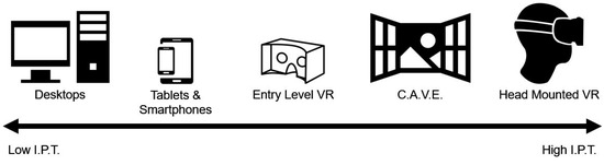 The virtual environment can be experienced in many ways, including form factors such as desktop computers, mobile tablet devices, smartphones, and head-mounted devices (Cruz-Neira et al. 1992). Boas (2013) reasoned that VR is specifically successful when it is capable of immersion, perception, and telepresence. Exploring these three facets of VR is necessary when considering the effectiveness and quality of viewer experience. All VR systems have varying levels of immersiveness, perception, and telepresence (I.P.T.), and it could be argued that no system today can completely render a VR environment that replaces every human sense (Kim and Leathem 2018). Figure 2 illustrates some available VR form factors and contrasts a non-quantitative representation of I.P.T. available within each form factor.