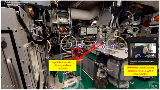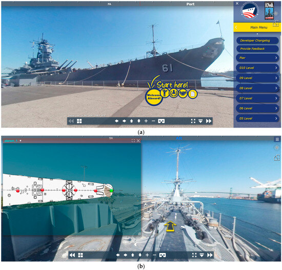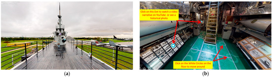 The VT technology has proven to be particularly beneficial for maritime museums, where physical access to historical vessels can be challenging due to location, preservation concerns, and the inherent mobility issues associated with navigating narrow passages and steep stairs. By creating digital replicas of these vessels, VTs allow visitors to explore every aspect of the maritime heritage site remotely, providing an immersive and detailed experience that mimics a physical visit. For example, the Battleship USS Iowa Museum in Los Angeles has utilized VT technology to create a comprehensive experience of the USS Iowa (Figure 3). This tour features high-resolution 3D imagery of the battleship’s interior and exterior, enhanced with multimedia elements such as photos, videos, and interactive hotspots that offer in-depth information about various parts of the ship and its history (Online Tour & Museum—Battleship USS Iowa Museum 2020). As maritime museums continue to adopt VTs, they can help overcome the limitations of physical visits and provide inclusive, educational experiences that engage a diverse audience.