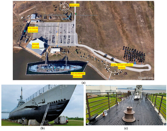 The USS Drum (SS-228) is a Gato-class submarine that played a significant role during WW II. Commissioned on 1 November 1941, it completed 13 war patrols and was credited with sinking 15 enemy vessels, totaling 80,580 tons, making it one of the most successful submarines of the war. The USS Drum received 12 battle stars for its service. After the war, it was decommissioned on 16 February 1946, and later transferred to the USS Alabama Battleship Memorial Park (BMP) in Mobile, Alabama, in 1969 (Figure 5a). As a National Historic Landmark, the submarine is the oldest American submarine on public display and serves as a key attraction at the park, which itself opened on 9 January, 1965 (USS Drum—USS Alabama Battleship Memorial Park n.d.). The BMP also houses the battleship USS Alabama (BB-60), various tanks, artillery, aircraft, and multiple memorials, including the Korean Memorial, Vietnam Memorial, POW Bracelet, and the Fallen Guardian Memorial. The museum attracts an average of 375,000 visitors annually, providing them with insights into naval warfare and the experiences of those who served on these historic vessels (Home—USS Alabama Battleship Memorial Park n.d.).