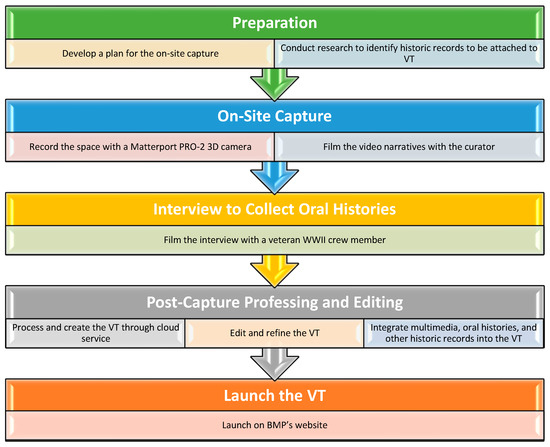 The primary goal of creating the VT of the USS Drum is to allow users to explore the submarine from an accessible position with realistic sensations, mimicking an in-person visit. As illustrated in Figure 6, the development process was divided into the following five main steps: preparation, on-site capture, collecting oral histories, post-capture processing and editing, and launching the VT.