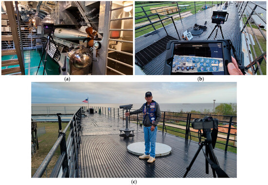 Project preparation involved formulating a detailed plan for capturing the submarine’s spaces and narratives. The project team conducted extensive research to gather relevant historical records, photographs, and other artifacts to enhance the VT. During the on-site capture phase, a Matterport PRO-2 3D camera was used to digitize the physical spaces of the submarine (Figure 7a), including its main deck (Figure 7b), interior compartments, conning tower, and bridge. This process required over 300 stationary setups of the PRO-2 to ensure comprehensive coverage. Additionally, short films were recorded on-site featuring the USS Drum’s curator (Figure 7c), who provided detailed explanations of various parts of the submarine. Next, the project team traveled to the state of Indiana and interviewed a veteran who served aboard the USS Drum as a radioman during WW II. The interview focused on his experiences during the war, and his oral histories were recorded to be integrated into the VT. Post-capture processing and editing included uploading the captured imagery to Matterport’s cloud server for processing. The platform automatically stitched the images together to create a seamless, navigable 3D model. The initial “raw” VT was then edited to enhance the user experience, ensuring the accurate alignment and calibration of the images. Multimedia elements, including photographs, videos, and oral histories (through YouTube), were embedded into the virtual space. Interactive hotspots were created, allowing users to access detailed information and narratives. Finally, the VT was launched on the BMP’s website, making the completed VT accessible to a global audience.