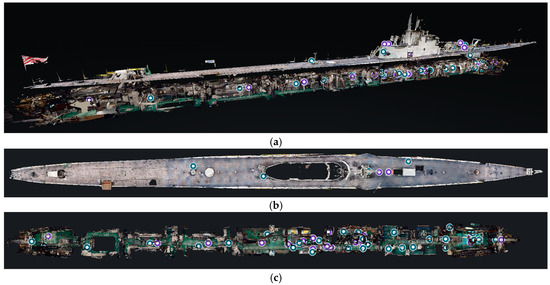 A 3D perspective view and plan views of the virtual tour. (a) A “dollhouse” view. (b) Main deck floor plan. (c) Compartment floor plan. Note: Green circles (or “tags”) link to short films featured by the USS Drum’s curator explaining the historical significance, technical specifications, and operational details of the submarine; purple circles link to short films of a WW II veteran and offer his personal accounts and stories aboard the USS Drum.