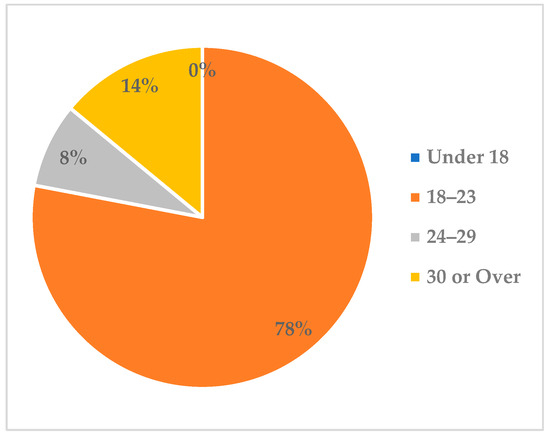 The survey began by collecting demographic information to understand the respondents’ backgrounds. The first question asked participants if they had used VTs before. Out of 92 respondents, the majority, 68.48% (63 participants), indicated that they had, while 31.52% (29 participants) had not. Data collected from the second question revealed that most respondents were male, comprising 85.87% (79 participants), while 14.13% (13 participants) were female. As shown in Figure 11, the age distribution indicates that the sample primarily consisted of young adults, with the majority falling within the 18–23 age range. The predominance of young adults and males in the survey sample reflects the typical demographic of students in a construction management program in the USA, who were the primary participants in this study.