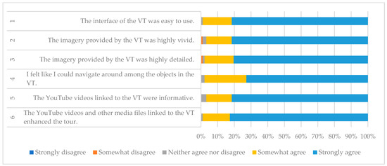 As illustrated in Figure 12, the respondents overwhelmingly agreed that the VT’s interface was easy to use, with a mean score of 4.8. Specifically, 81.52% of respondents strongly agreed, and 17.39% somewhat agreed, indicating high usability. The imagery provided was rated as highly vivid, with a mean score of 4.77; 81.52% of respondents strongly agreed and 15.22% somewhat agreed, reflecting the quality of the visual content. Similarly, the detailed nature of the VT imagery received a mean score of 4.77, with 80.43% of respondents strongly agreeing and 17.39% somewhat agreeing, suggesting that respondents found the VT to be visually detailed and informative. Navigation within the VT was also highly rated, with a mean score of 4.71; 72.83% of respondents strongly agreed and 25% somewhat agreed, highlighting the effective navigation design. The YouTube videos linked to the VT were considered informative, receiving a mean score of 4.78; about 81.52% of respondents strongly agreed and 15.22% somewhat agreed, indicating the usefulness of the additional video content. Furthermore, the YouTube videos and other media files linked to the VT were perceived to enhance the tour, with a mean score of 4.82; approximately 82.61% of respondents strongly agreed and 16.30% somewhat agreed, showing that multimedia elements significantly contributed to the overall experience.