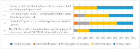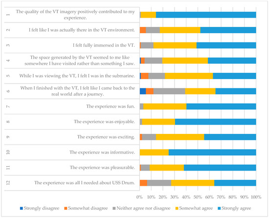 As shown in Figure 13, the quality of the VT imagery was highly appreciated by respondents, with a mean score of 4.84; 85.87% strongly agreed that it positively contributed to their experience, and 13.04% somewhat agreed, indicating significant visual fidelity. The tour also created a strong sense of immersion, with statements like “I felt like I was actually there in the VT environment” and “I felt fully immersed in the VT” receiving mean scores of 4.25 and 4.38, respectively. This suggests that the VT successfully engaged users by providing a realistic environment. Additionally, the VT was effective in making users feel like they were in a real, physical space, as indicated by a mean score of 4.16 for the statement about the space feeling like “somewhere I have visited” rather than “something I saw”. The tour’s ability to provide an entertaining and enjoyable experience was also reflected in high scores for fun (4.56) and enjoyment (4.67). Furthermore, the VT was considered highly informative, with a mean score of 4.75, showing its effectiveness in conveying information about the USS Drum. Overall satisfaction was high, with the statement “The experience was all I needed about USS Drum” receiving a mean score of 4.02, indicating that most users felt the VT provided a comprehensive and satisfactory overview of the submarine.