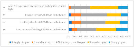 For the 77 respondents who had never visited USS Drum in person, as shown in Table 5 and Figure 15, the VT significantly increased their interest in visiting the submarine, with mean scores of 3.75 for increased interest. Furthermore, the VT positively influenced their intention to visit, as reflected in the mean scores of 3.22 for expecting to visit, 3.25 for the likelihood of visiting, and 3.53 for seeing themselves visiting in the near future. Overall, the VT effectively enhanced interest and intention to visit the USS Drum among those who had not experienced an in-person visit.
