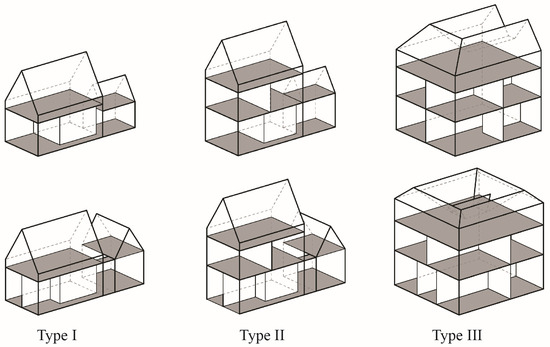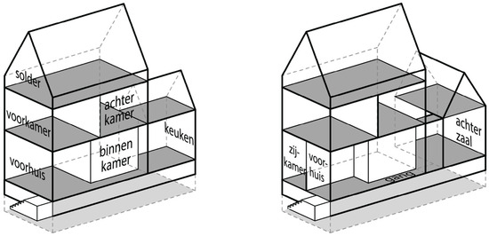The second house type is a two-story “deep house”, which retains the same narrow construct of the Type I house but includes an additional floor between the ground floor and the attic (Figure 7). This house type portrays the foremost common canal houses and defines the urban landscape in the inner city of Amsterdam to the present day. Type II houses were home to a large portion of the city’s middle-class households in the seventeenth century, comprising more than half of the inventory sample in this study.