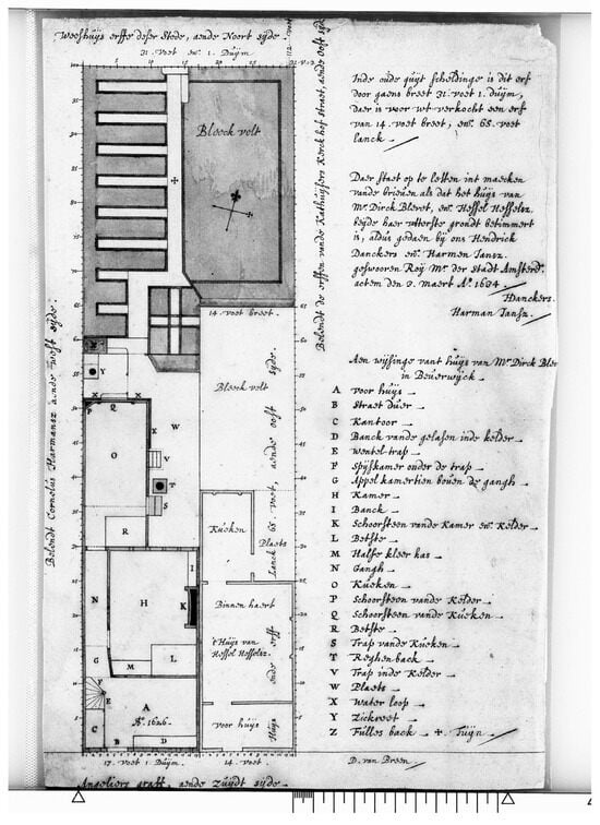 Behind the binnenkamer, one may find an additional achterkeuken (back kitchen), dedicated to cooking, or another back room (achterkamer) appended to the inner hearth (Corbeau 1993), as Daniël van Breen’s floorplan shows (Figure 6). The space beyond the inner hearth—be it a kitchen, a courtyard (binnenplaats), or an achterhuis—could be reached through a gang (corridor), connecting the rear side of the house back to the voorhuis without passing through the rooms behind voorhuis on the ground floor (such as the space marked N in van Breen’s drawing). In some cases, an achterzaal (back hall) or a beste kamer (best room) could be added to the basic layout, often as an adjacent space behind the binnenkamer. More often, they appeared in the inventories after the gang, portaal (passageway), or open plaats (inner courtyard), and therefore were more likely located in the achterhuis.