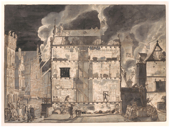 Jan van der Heyden (1637–1712), Cross-section of a burning house with firefighters, ca. 1690, drawing, 34 × 46.1 cm, Amsterdam: Amsterdam City Archives, inv. JVDH00007000001. Design for the second print published in Beschryving der nieuwlyks uitgevonden en geotrojeerde slang-brand-spuiten 1690 (description of the recently invented and patented hose fire engine) (artwork in public domain).