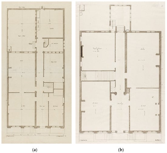 Johannes Vingboons after Philip Vingboons, (a) Plan of the house built for Nicolaes van Bambeeck, Kloveniersburgwal 77, Amsterdam, 1650; (b) Plan of the house built for Karel Gerards, Herengracht 386, Amsterdam, 1663–1665. From Afbeeldsels der voornaemste gebouwen uyt alle die Philips Vingboons geordineert heeft, Amsterdam, 1674 (artwork in public domain).
