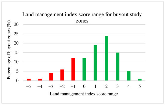 Once all the stewardship codes were evaluated for positive and negative values, we summarized the scores to create a land management index score for each buyout zone (Figure 2). The scores on this index ranged from −5 to 5, with negative scores indicating poor land management practices and positive scores indicating more normative, aesthetically pleasing practices (Figure 3). For each buyout zone, we calculated descriptive statistics of the land management index scores, including the mean and frequency. These index scores were also used in phase three for spatial analysis, as discussed in Section 3.