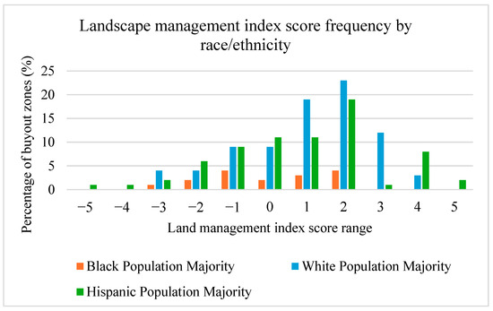 Of the 188 zones analyzed in this study, approximately 46% were in areas with a majority-white population, 44% were in Hispanic-majority areas, 9% were found in areas with a majority-Black population, and none were in Asian-majority neighborhoods. The analysis did not show significant differences in the land management index scores by race and ethnicity, although the range of index scores and modes identified more nuanced results. For neighborhoods with a majority-Black population, 44% of the study zones had negative land management index scores. However, none of the study zones in Black-majority neighborhoods scored higher than 2 on the land management index; index scores ranged between −5 and 2, with a mode of −1 (Figure 4). Scores among white- and Hispanic-majority neighborhoods were similar, with 79% of Hispanic-majority neighborhoods and 77% of white-majority neighborhoods scoring positive indexes, and both groups scored a mode of 2 on the land management score index. However, Hispanic-majority neighborhoods had more scores above 2 on the index than white-majority neighborhoods, indicating improved maintenance and care of the open space. Taken together, these data show that white- and Hispanic-majority neighborhoods more frequently experienced positive land management index scores and higher positive index values, suggesting more aesthetically pleasing practices in these neighborhoods when compared to Black-majority neighborhoods.