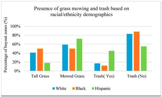 Land management as indicated by grass mowing and trash removal compared with buyout zone race and ethnicity characteristics in Harris County, Texas.
