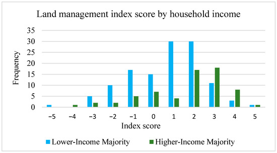 We then compared household economic status with land management practices in the study zone neighborhoods. We spatially compared Harris County’s median household income at the block group level with the landscape management index score (Figure 7). We observed that over 65% of the buyout study zones occurred in lower-income areas, while the remaining 35% occurred in higher-income areas. The analysis of the land management index score as it related to the economic status of Harris County residents did not show significant differences between lower- and higher-income areas. Among the higher-income population, 75% had a positive landscape management score (0–5), while 73% of the lower-income community had a positive landscape management score. However, the mode of the land use management index score in the majority-higher-income areas was 3, whereas for the majority-lower-income areas, it was 2 (Figure 7).