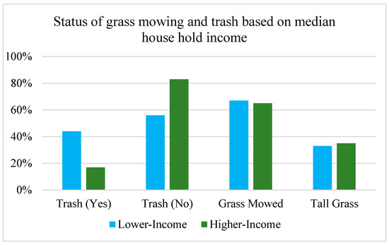 We also examined the association between the Harris County residents’ economic status and open space management using two indicators: grass mowing and garbage dumping (Nassauer 1995, 1997). Beginning with lawn mowing, we compared median household income status and grass length. Our data indicated that there is not much variation in the state of grass mowing between regions with higher- and lower-income majorities (Figure 8). Regarding the prevalence of trash and garbage in the buyout zones, we found that majority-lower-income regions have a larger percentage of trash (44%) than majority-higher-income areas (17%). These findings suggest that littering and unlawful dumping rates differ according to the neighborhood’s socioeconomic standing.