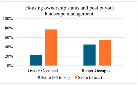 Finally, we examined homeownership status compared with post-buyout land management. The results from the spatial analysis indicate that 45% of renter-occupied properties had negative post-buyout land management, whereas 23% of owner-occupied properties scored negatively. Buyout zones with majority owner-occupied status had a mode of 2 in terms of landscape management index score, while renter-majority areas had a mode of −1 (Figure 10).