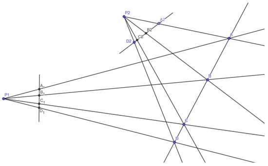 Regarded in this way, this diagram is meant to be taken as a two-dimensional one—the theorems here hold regardless of any three-dimensional interpretation given to the lines or points involved. Basic projective geometry simply studies various configurations of points and lines on a plane. Nevertheless, we might imagine the diagram as a schematic representation of the viewpoints of, say, two painters, viewed from above, their viewpoints represented by P1 and P2, with the nearer, short sectioning lines representing the picture planes of the canvases on which each is portraying a common scene. Thinking of points A, B, C, and D, as points on objects within a three-dimensional common scene, we can now appreciate how the constancy of the cross-ratio might allow us to think of relations among perspectivally different representations of that scene.