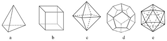 Figure 2. (a) Tetrahedron; (b) cube; (c) octahedron; (d) dodecahedron; (e) icosahedron.