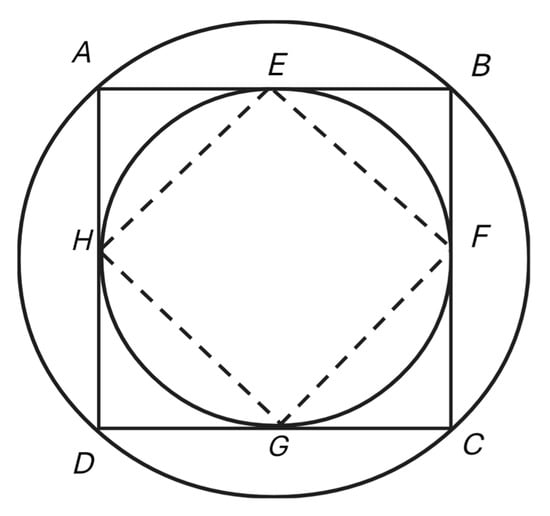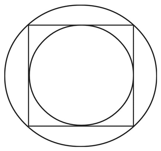 Such duality will prove highly relevant to the principles according to which polyhedra can be homocentrically nested; to see this, we might simplify the idea of nesting them by starting, as had Kepler initially,22 with the nesting of two-dimensional polygons separated by inner and outer circles. Thus, consider, for example, a simple square with its inner and outer circles, as in Figure 3.