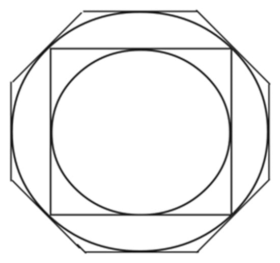 Here, a square contains a circle that touches each of its sides and is circumscribed by a second circle that passes through each of its vertices. It is now easy enough to envisage how another regular polygon, concentric with both the square and the two circles, might be constructed such that its sides touch the square’s outer circle as tangents, as does the added octagon, for example, in Figure 4.