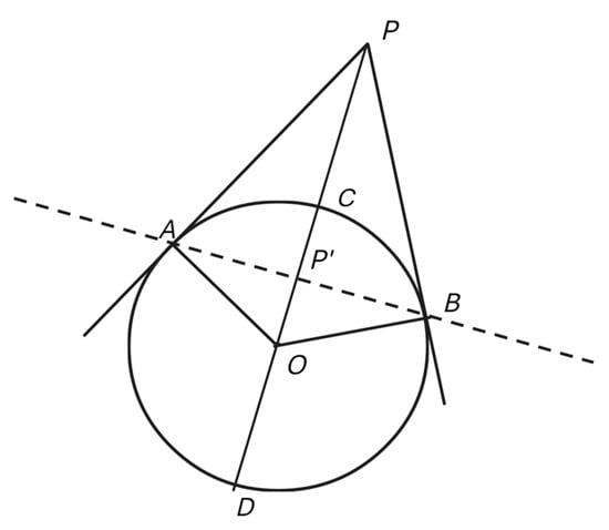 For a pole P, the corresponding polar, the line AB, can be found as illustrated in Figure 5. When two lines are drawn from P so as to tangentially touch the circle at points A and B, the line joining points A and B will be the polar of P with respect to that circle. The point P′, at which the polar intersects the line joining the pole (P) to the centre of the circle (O), is called the inversion of P25 and, it turns out, that a particular relation will hold among distances marked out by the pole and its inversion with respect to the circle, in that the product OP·OP′ = OA2. Without much algebra, the Greeks would have expressed this arithmetical relation geometrically—that is, in terms of areas, such that the area of a rectangle with sides OP and OP′ would be said to be equal to the area of a square with a side the length of the radius of the circle.